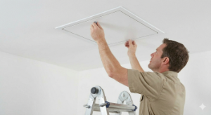 Aby zainstalować panel dostępu do sufitu , musisz zmierzyć wewnętrzny kołnierz panelu , wytnij odpowiedni otwór w płycie gipsowo-kartonowej, unikając belek stropowych i zabezpiecz ramę za pomocą kleju budowlanego lub łączników mechanicznych. W przypadku standardowego dostępu do instalacji wodno-kanalizacyjnej lub elektrycznej w budynkach mieszkalnych: a Plastikowy panel o wymiarach 12 x 12 cali jest najczęstszym wyborem ze względu na lekkość i łatwość instalacji.