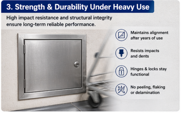 Panele dostępowe w obszarach o dużym natężeniu ruchu są narażone na wielokrotne otwieranie, zamykanie, uderzenia i obciążenia fizyczne. Panele ze stali nierdzewnej są znacznie bardziej odporne na uderzenia niż plastikowe lub standardowe panele dostępowe z płyt kartonowo-gipsowych. Austenityczna stal nierdzewna (najpowszechniej stosowana w panelach) ma wytrzymałość na rozciąganie około 515–620 MPa w porównaniu do około 150–300 MPa w przypadku stali miękkiej i znacznie mniej w przypadku alternatywnych rozwiązań polimerowych.