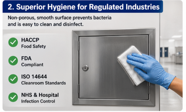 Higiena nie podlega negocjacjom w służbie zdrowia, przetwórstwie żywności i środowisku farmaceutycznym. Panele dostępowe ze stali nierdzewnej zapewniają nieporowata, gładka powierzchnia co zapobiega osadzaniu się bakterii, pleśni i zanieczyszczeń w materiale. W przeciwieństwie do paneli ze stali malowanej lub tworzyw sztucznych, stal nierdzewna nie wchłania wilgoci ani nie sprzyja rozwojowi drobnoustrojów.