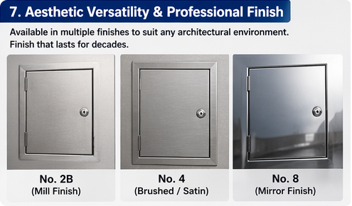 Oprócz funkcjonalności, panele dostępowe ze stali nierdzewnej zapewniają czysty, profesjonalny wygląd, który pasuje do szerokiej gamy środowisk architektonicznych. Materiał dostępny jest w kilku standardowych wykończeniach: