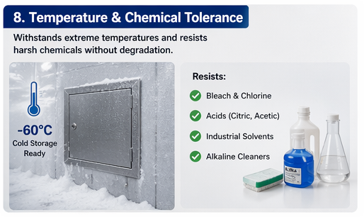 Niektóre instalacje wymagają paneli dostępowych odpornych na ekstremalne temperatury lub regularny kontakt z agresywnymi chemikaliami. Stal nierdzewna sprawdza się w obu przypadkach. W chłodniach i zamrażarkach, gdzie temperatura może spaść do –60°C stal nierdzewna zachowuje swoje właściwości mechaniczne, nie stając się krucha – jest to znana przyczyna awarii paneli z tworzyw sztucznych w środowiskach kriogenicznych.